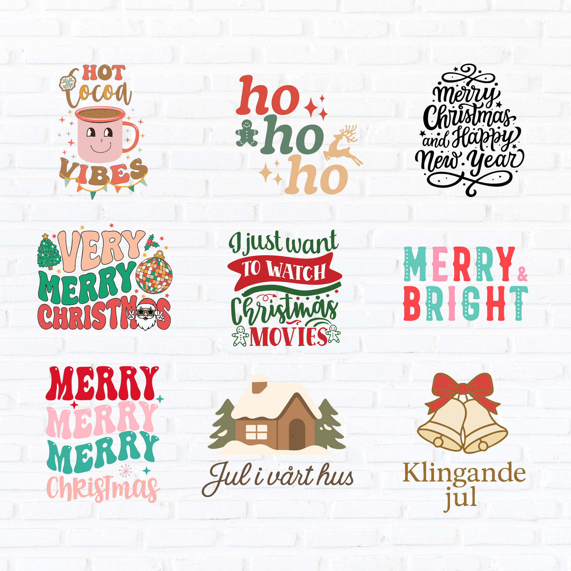 Skapa vackra dekaler till glas, kläder, kaffemuggar, julkulor, presentpåsar, vattenflaskor, klistermärken och mycket mer! Här hittar du allt från söta tomtar, snögubbar och renar till kransar, julgranar, pepparkakor, julcitat och andra härliga julmotiv. Möjligheterna är oändliga!