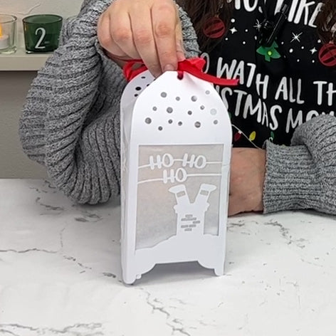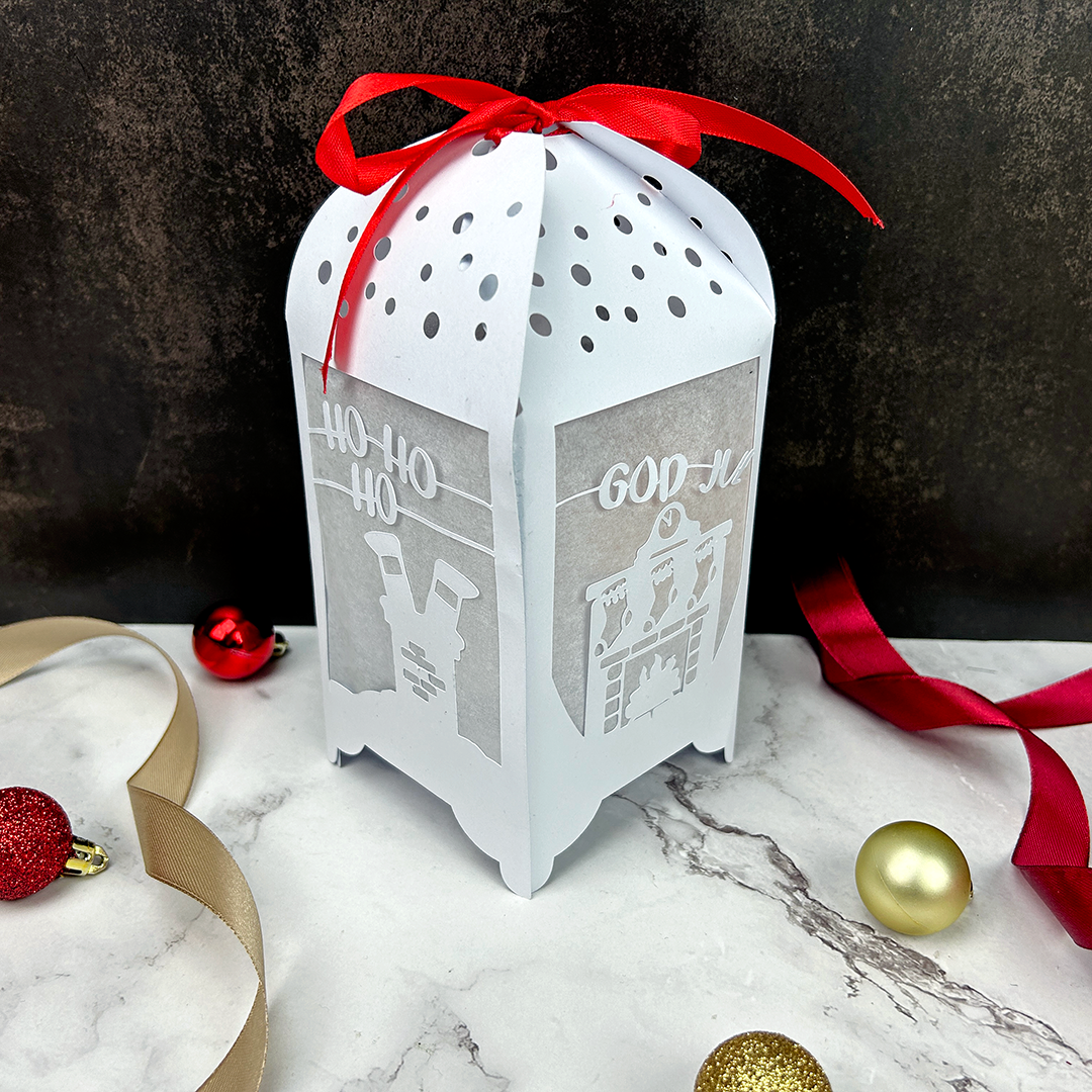 Pyssla en vacker ljuslykta av papper för att lysa upp i vintermörkret. Lyktan har fyra olika juldesigner, en på var sida av lyktan.
